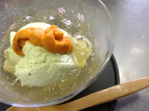 万願寺唐辛子のムース。昨日の揚げ浸しがこれに化けました。北海道の海水ウニをあしらっております。