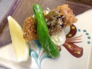 甘鯛(ぐじ)のフライ。鱗を付けたまま身だけにパン粉を付けて揚げてあります。自家製のタルタルソースで。
