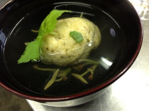 アワビしんじょうと蓴菜のお椀。正統な日本料理らしく。アワビをすり下ろし、すり身と合わせ蒸した肝と身も入れ込んであります。贅沢な一品に仕上がりました。