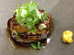 丸ナスの醤油焼きとフォアグラのソテー。フォアグラと醤油って相性いいんです。九条ネギをアクセントに。