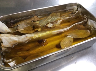 秋刀魚のコンフィ。ここ数年、秋の人気メニューです。今年は秋刀魚の値段がなかなか下がらず仕込みができませんでしたが、いつまでも待てないので仕込みました。今年からほうろく菜種油を使用。絶対美味しいはずです。