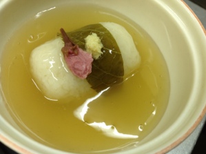 道明寺(もち米を蒸して乾燥)を出汁で戻して中には白身魚を焼いたものを包んであります。桜の葉を巻いて蒸しあげ、熱々のあんをかけて。