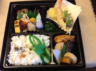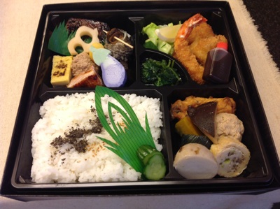 楽山のお弁当。必ず揚げ物が入ります。その時によりますがまぁ、天ぷらかフライ。