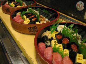 例えばこんな風に、巻物、マグロのづけ、いくら醤油漬け、玉子焼きなど。お醤油無しで食べてもらえるお寿司オードブルのご提案です。醤油のお皿ってパーティーなんかでは邪魔でしょう。酔っ払ってこぼす人もいるでしょうし。巻物も鉄火巻きはづけにしてあるし、新香巻、牛蒡巻きなら醤油はいりません。楽山名物の穴子や松前寿司を入れれば十分おつまみ、ご飯代わりになることうけあいです!
