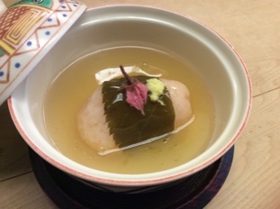 道明寺(もち米を蒸して乾燥させたもの)を出汁に浸して白身魚を入れて蒸してあんかけにしてあります。