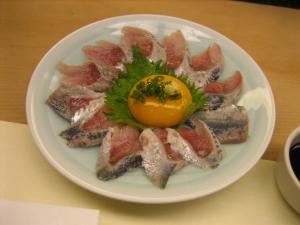いわしを薄造りにして真ん中に卵黄を乗せ葱とおろし生姜を添えて。醤油をかけてユッケ風に召し上がっていただきました