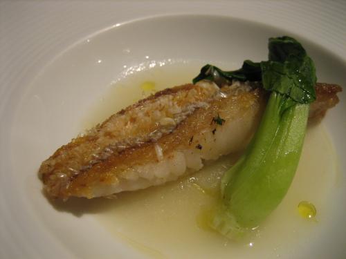 そして、メインディッシュ!ぐじをうろこがついたまんまパリッと焼いて冬瓜のすり流しのソース。「ぐじ」いわゆるアマダイです。ボクもよくうろこつきでよくつかいますが、この料理はめっちゃ美味かった!