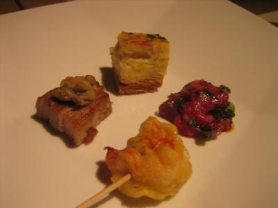 2皿目のアミューズ。奥から時計回りに自家製のキッシュ。牛肉のマリネ?みたいなものに海老のフリッター。衣にビールを使ってあるそうです。豚バラをカリカリにソテーしたものに豆をのせたもの。ここのキッシュがめちゃ美味い!おすすめ。