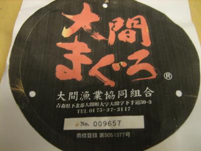 これです。そして、よーくみてください。下部に数字が入っています。これは大間産本マグロを登録商標してからのシリアルナンバーだそうです。4,5年前からの通しの数字です。