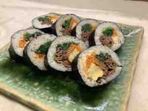 ほうれん草と人参のナムルと神戸牛、歩荷さんの玉子焼きのキンパ。