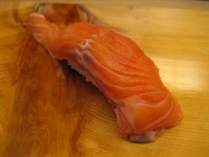 握っても美味。養殖のサーモンほど強烈な脂はありませんが、食べると優しい春の味がします。