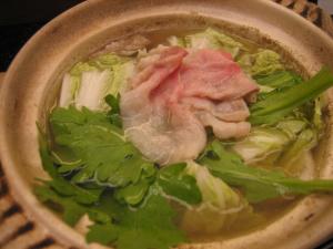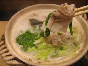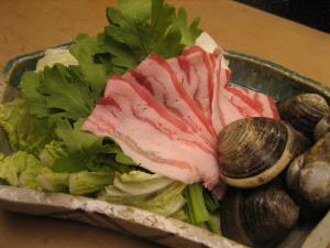 これです。名の通り、蛤と豚肉中心のお鍋で、野菜はシンプルに白菜(キャベツのときもあり)と菊菜(水菜とか三つ葉のときもあります)のみ。豚肉は主に沖縄のあぐー豚を使用。