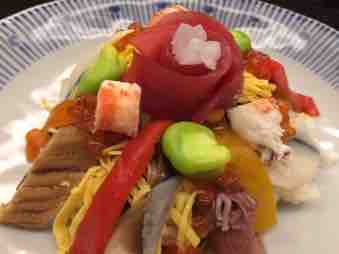春野菜、鳥貝、さより、ホタルイカなどの春の食材をあしらったちらし寿司になります。