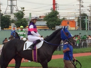木前葵ジョッキー。小柄な女性。500キロにもなるサラブレッドをよく扱えるなぁと感心。