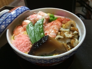丼に入れられた蒸し寿司。江戸前のばらちらしとは一線を画します。