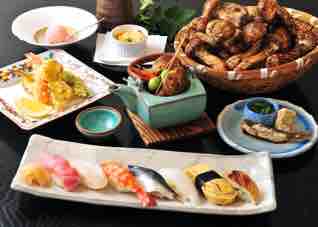 小鉢、松茸土瓶蒸し、松茸とカニのグラタン、松茸入り天ぷら盛り合わせ、中トロ入り握り7貫、デザート