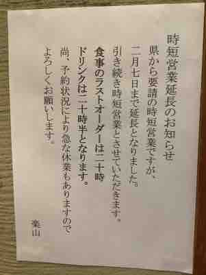 17日(日)までは21時までの時短営業、食事のオーダーストップは20時、ドリンクは20時半となります。