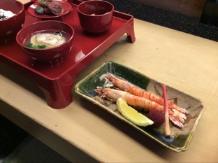 炊き合わせ、蛸の酢の物、蛤のお吸い物、ご飯、香の物、有頭海老の塩焼き。