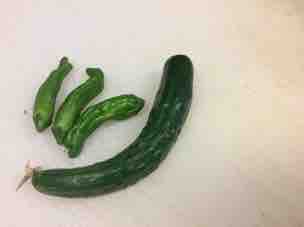 今朝、畑をのぞいたら、初生りの胡瓜とししとうがなっていました。