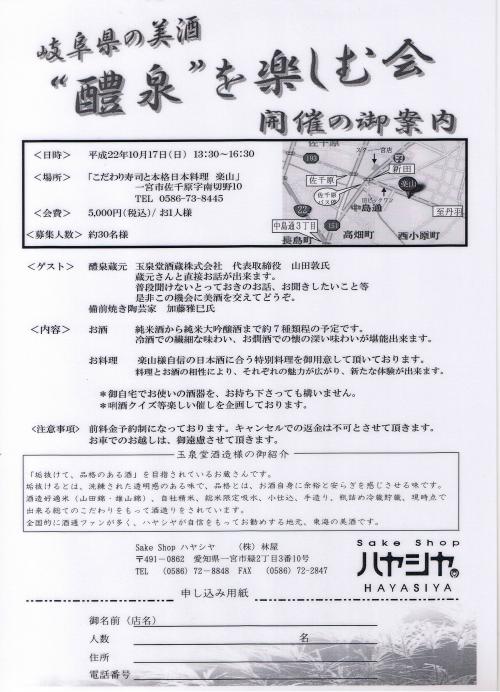 東海の蔵元「玉泉堂酒造」さんの社長さんに来ていただき当日は約7種類の日本酒を試飲していただく予定です。