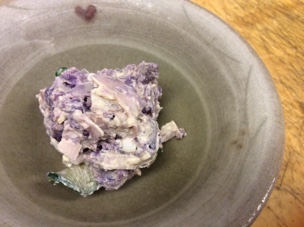 これも大将の畑で採れたシャドウクイーンで作ったポテサラ。紫陽花みたいでしょ?
