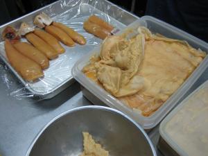からすみの味噌漬けです。西京味噌、信州味噌、麹味噌と酒かす、味醂、酒を合わせて、に塩漬けした後、塩抜きして2ヶ月漬け込みました。