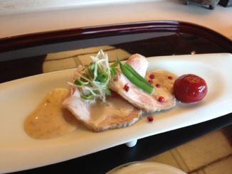 先付け。蒸し豚のゴマだれ掛け。夏の先付けとしては最適。食欲をそそります。