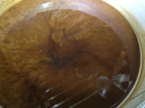 楽山の赤出汁のベースです。楽山の赤出汁はその場で合わせるのではなく、鰹だしにクズ野菜をたっぷり入れ煮出して信州味噌と八丁味噌を合わせて追い鰹をしっかり効かせて置いておきます。オーダーが入るとこのベースを出汁で薄めて調整して提供します。