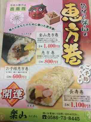 楽山恵方巻 楽山名物穴子をどんと入れた恵方巻。7種類具材です。1400円