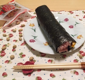 自分で作った恵方巻の写真の脇には豆まき用の豆が写っていました。