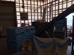 高く積まれた飼料です。すべて安全なものを使用。籾殻のついた米に、とうもろこし、大豆、糠、牡蠣の貝殻など。