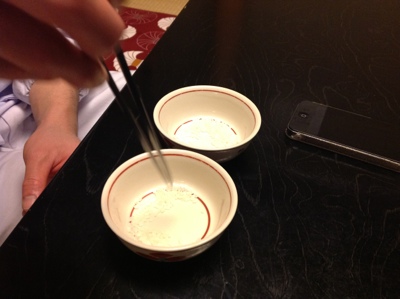 俎箸という鉄の箸を使って生米を器から器に移します。