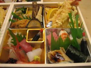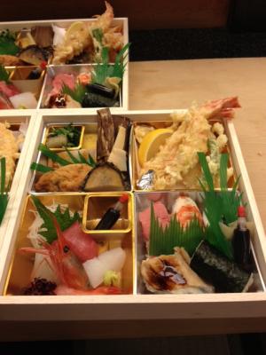 活けの車えび天ぷらだとか蒸し鮑、大間のマグロまで入っている豪華版。白木の弁当箱で映えますな。