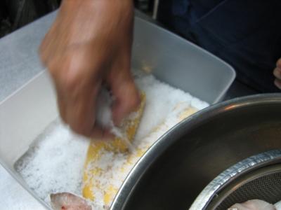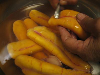 水につけながら血管の血を抜いていきます。地道な作業です。手抜きすると生臭みが残ってしまいます。