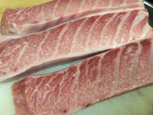 下に行けば行くほど赤身が増えて脂が薄くなる。単価は安くなるけど、どうしてもトロの部分が高くついちゃうのです。