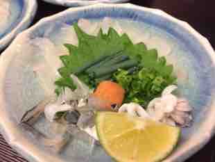 ふぐ皮のサラダに、ふぐの握り、てっさ、唐揚げ、てっちり、雑炊。まだ白子は成熟してないのありませんが今なら天然ふぐのコース、おひとり7000円ぐらいでご用意できますよ。楽山のふぐコースはてっさ用、てっちり用とポン酢の味を変えています。飽きずに食べていただけるのも楽山のウリだと思っています。