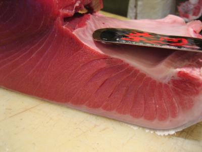 今日のはちょっと魚体も小さく70キロ台。延縄です。でもなかなかの脂ですよ!