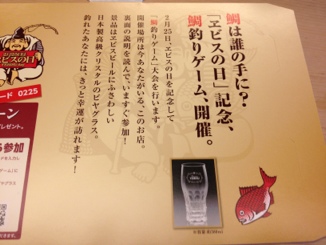 2月25日はエビスの日。エビスビールは誕生して123年。エビスの日記念。今年はスマートフォン、携帯を使っての鯛釣りゲーム。景品は日本製高級クリスタルグラス。