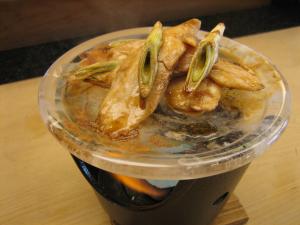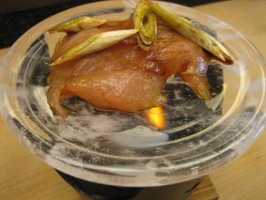 こうして固形燃料を使って焼物に使うんです。写真はカジキのもすりと葱。