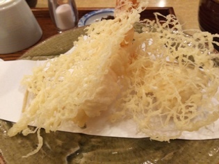 天ぷらも独創的。海老は2本くっつけて衣のつけ方も初めての感じ。であってサクッと揚がっています。