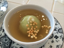 鰻の入ったしんじょうにささがき牛蒡、絹さやに柚子、山椒を少し添えて。