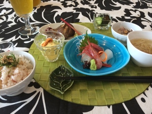 胡麻豆腐に白和え、ホタテのマリネにマグロと鯛のお造り、鶏の酒盗焼、えびしんじょうのお吸い物にピースご飯。