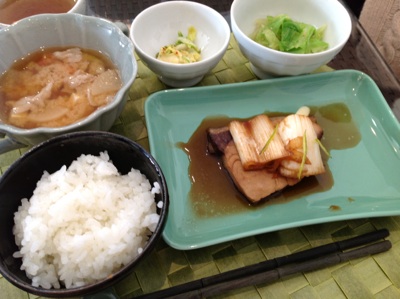 龍の瞳のお米にキャベツのおひたし、具沢山のお味噌汁(豚汁)に漬物、そしてブリの煮付け。