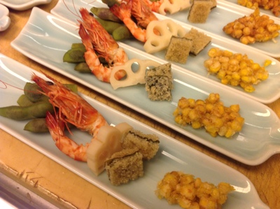 先付け 「寿限無」 八寸風 黒豆の枝豆 海老の艶煮 子持ち昆布のおひたし 酢蓮根 玉蜀黍のかき揚げ