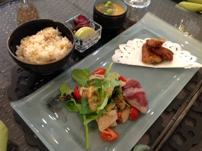 マグロ、白身、ホタテのお刺身をアレンジしてサラダ風に。後は短冊のマグロを使った「マグロの竜田揚げ」「冷やし茶碗蒸し、新生姜の炊き込みご飯、自家製漬物」