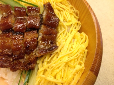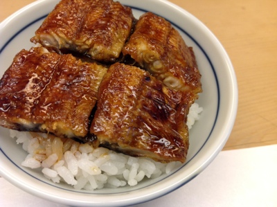 「鰻ミニ丼、出し巻き玉子、うの花、茄子とピーマンの揚げびたし、吸い物」