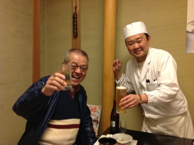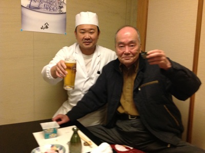 山田様。81歳になられます。さかえ鮨開店2日目にみえてずーっと常連。最近は高齢で来店数は減りましたが、まだまだお元気。この方、ボクの出産の時もさかえ鮨のカウンターで飲んでましてね。実はボク難産だったらしんです。病院からおばあちゃんがヤバイって電話してきて大将はそれを聞いて右往左往。それを不審に思った山田さんが大将に聞くと