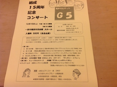 いつもご贔屓にしてくださるお客様、山口さん率いる男性コーラスグループ「G5」今年で結成15周年だそうです。すごいですねぇ。プロのグループでもさっさと解散しちゃうグループもあるんですから。ボクは2回ほどディナーショーにお邪魔したのですが、素晴らしいグループなんですよ。歌はもちろんですが山口さんのMCも最高。そんなグループの記念コンサートが500円で楽しめちゃうんです!12月15日(土)場所は一宮尾西市民会館。午後1時30分開場2時00開演です。絶対おすすめのコンサート。ぜひお出かけください!