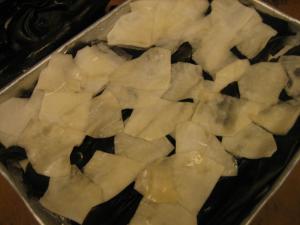 かぶらの昆布締め。スライスしたかぶらを昆布にはさんで重石をのせて一晩おきます。まぁ漬物みたいなもんですね。しっかり、昆布の風味が染み付いて料理のアクセントになります。