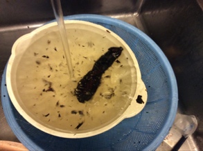 全体が焼けたら冷水に落とします。人によっては水につけたら味が抜けると言いますが、ボクは熱いから(笑)水に落とします。そして素早く皮を剥きます。しっかり焼いてあれば皮は簡単に剥けますよ。写真をよくご覧ください。ボールの下にザルが引いてありますよね。これがミソ。ミソと言っても味噌じゃありません(笑)こうすることによって剥いた皮がザルに集まってシンクの掃除が楽なんです。